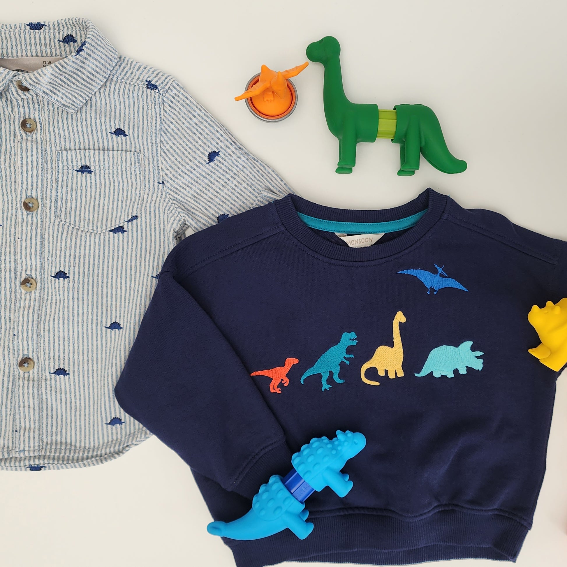 With a gorgeous Monsoon embroidered dinosaur jumper, smart John Lewis all over print shirt and SmartMax My First Dinosaur set.