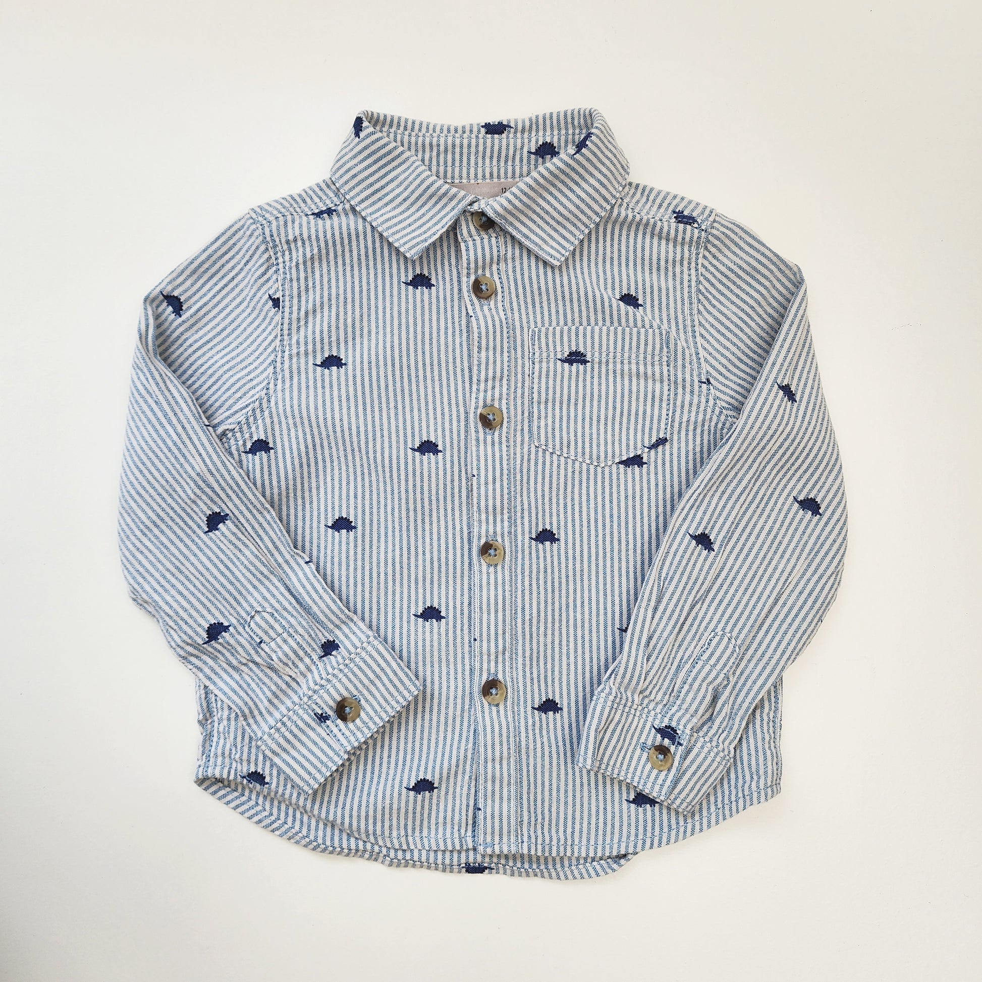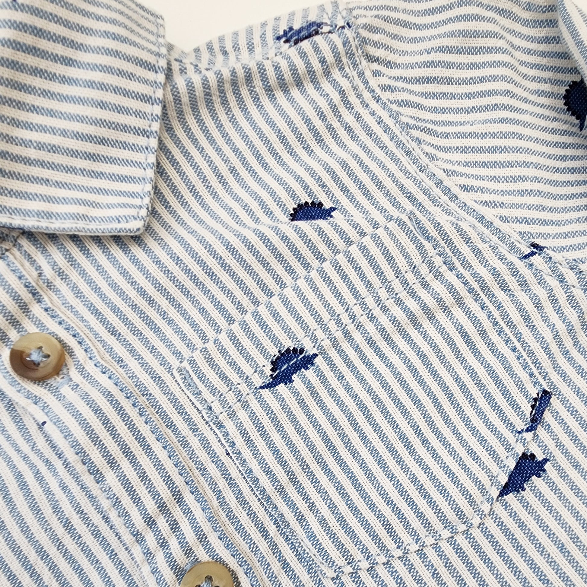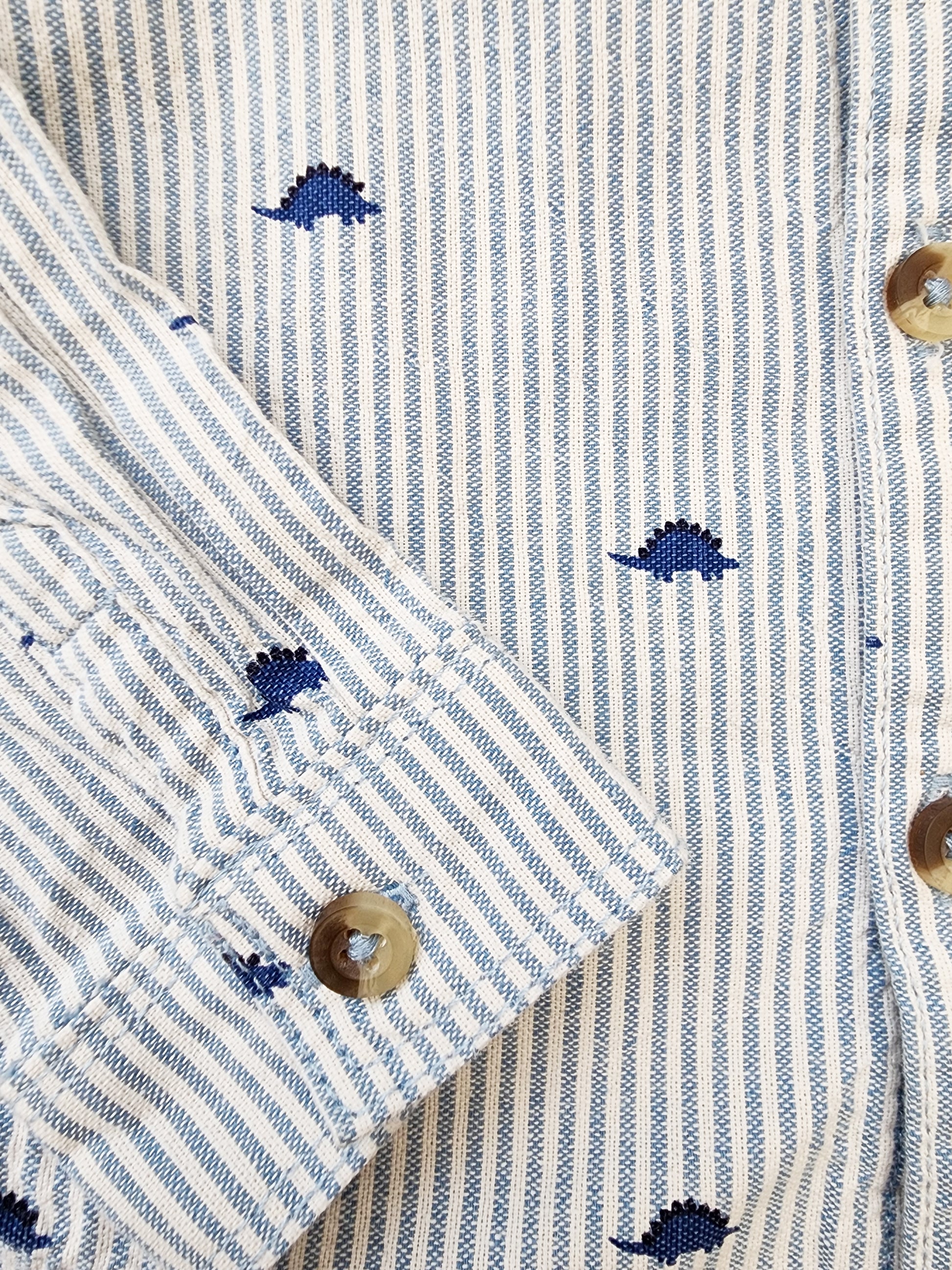 The cosy jumper is made from super soft cotton and the organic cotton striped shirt with all over dinosaur print will look very cute on a little stomper-saurus.