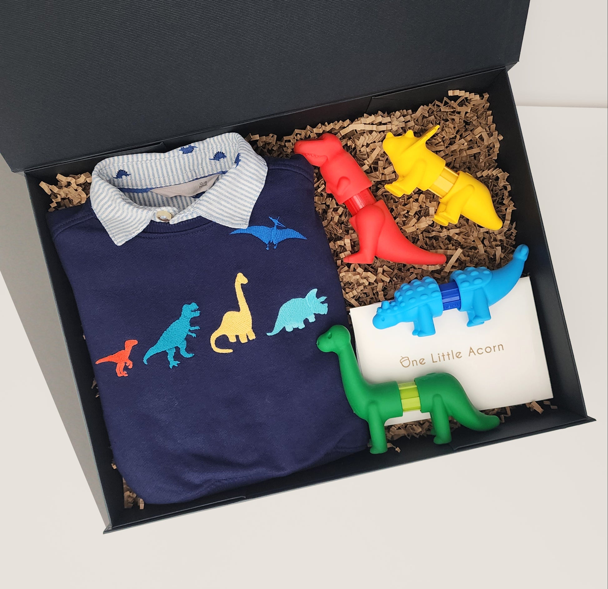 This cutie-saurus dinosaur themed box is the perfect gift for a first birthday!